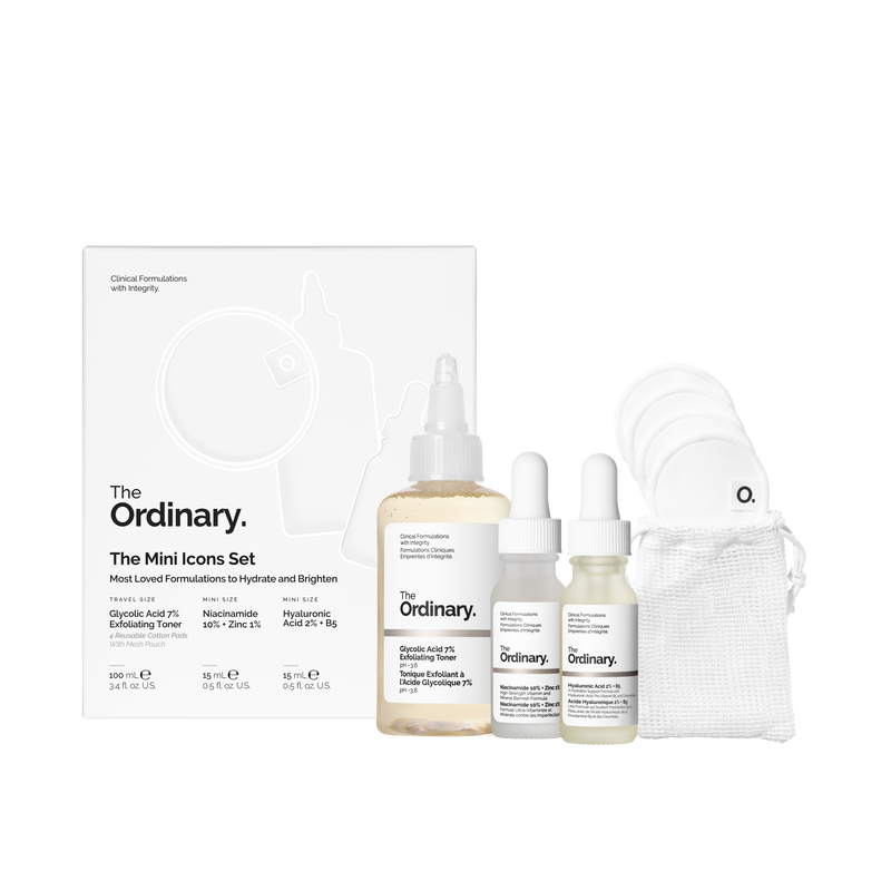 The Mini Icons Set includes three miniature sizes of some of our most-loved formulations, ideal for travel.